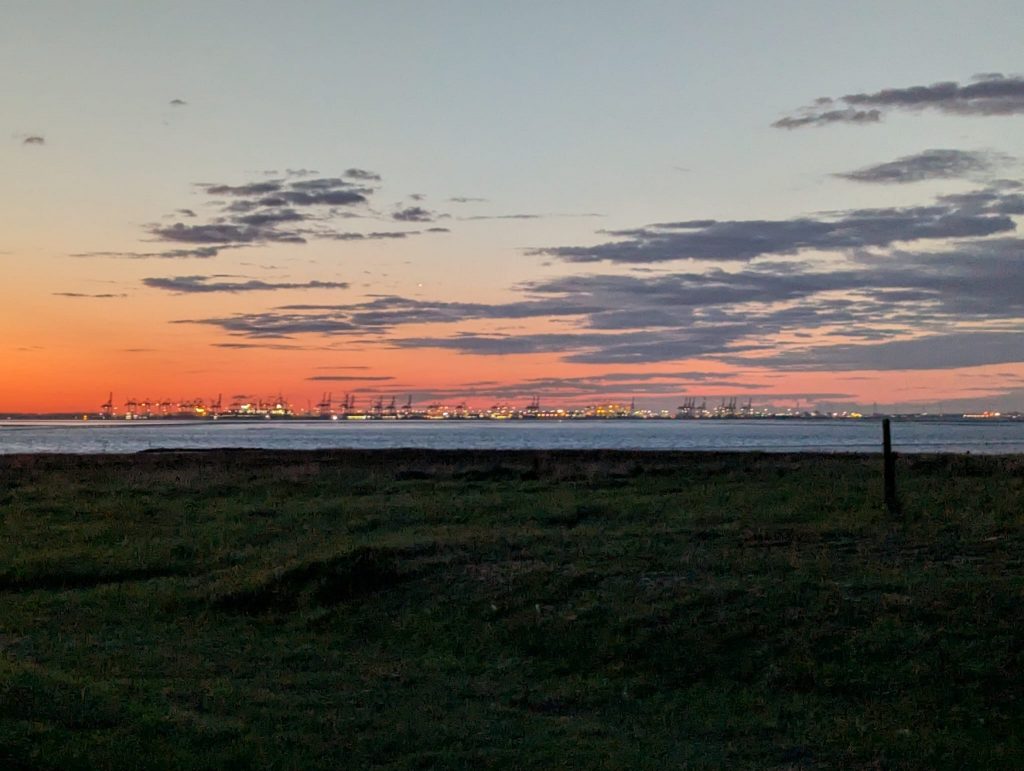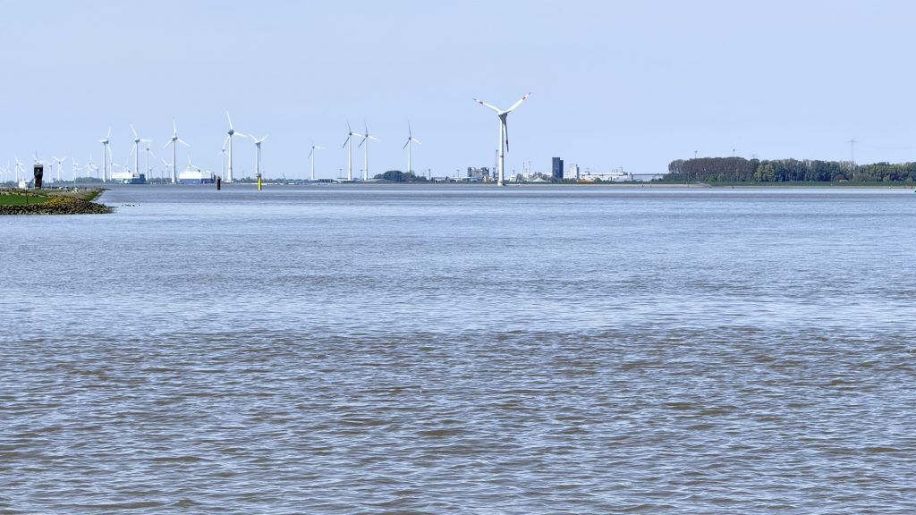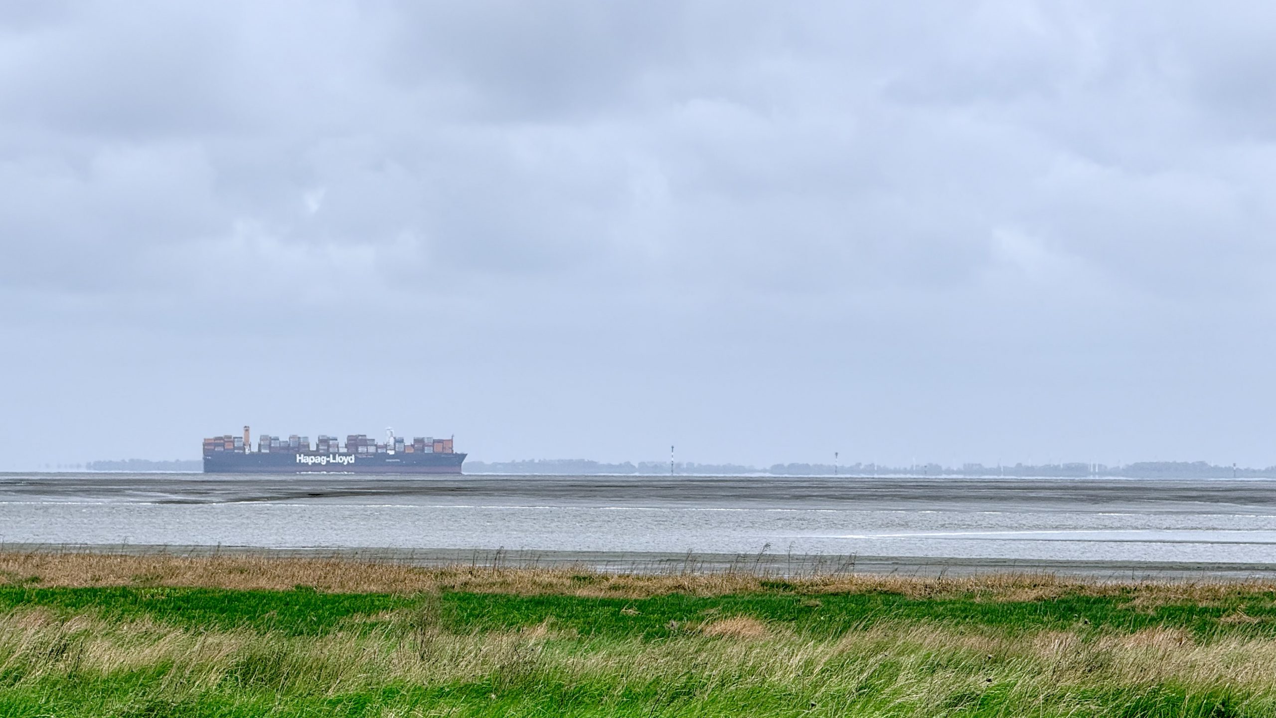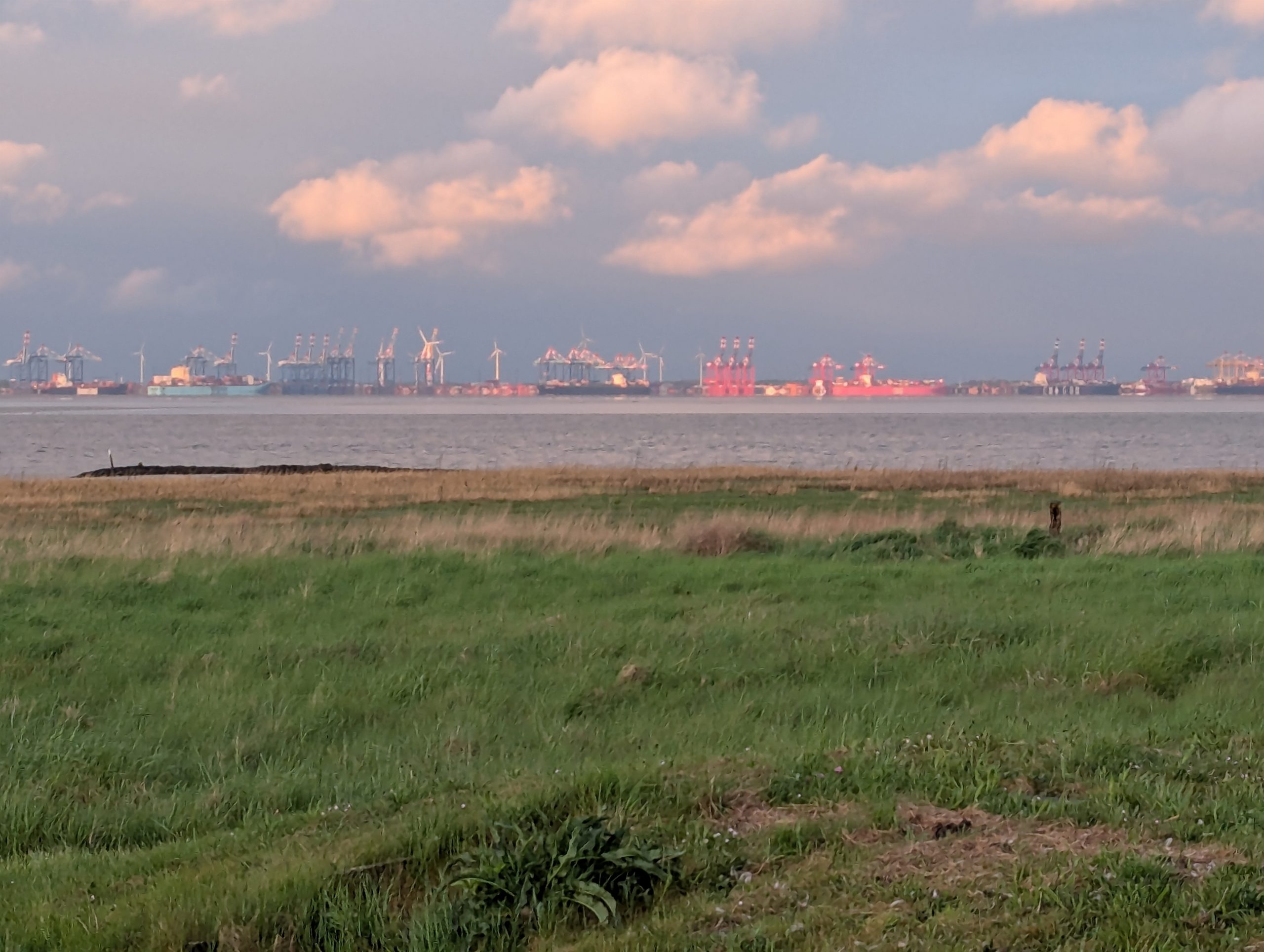 Des­halb sind wir am Sams­tag nach Fed­der­war­der­siel gefah­ren, von wo aus man den Blick auf die Con­tai­ner­ter­mi­nals in Bre­mer­ha­ven, auf der ande­ren Sei­te der Weser, hat. In Fed­der­war­der­siel gibt es vier Mög­lich­kei­ten, wir haben den „Regen­bo­gen“ Stell­platz gewählt. Das war eine gute Wahl, denn hier war zwar nix los, aber für 19 € pro Nacht alles inkl. Hof­fent­lich bleibt das so!