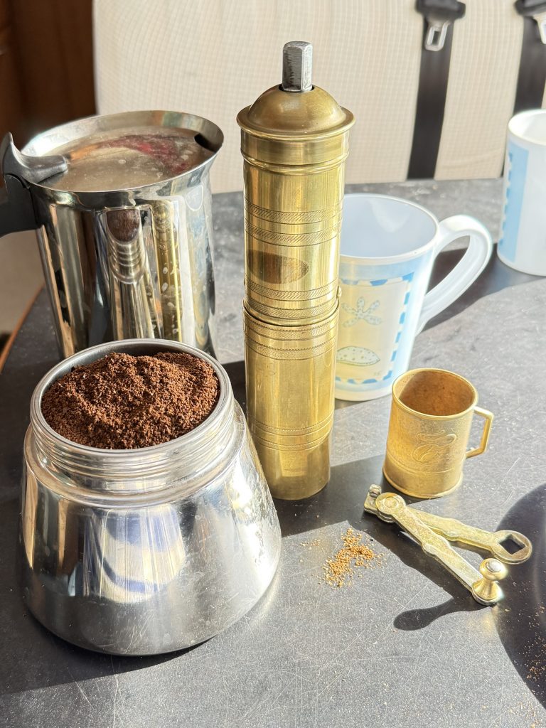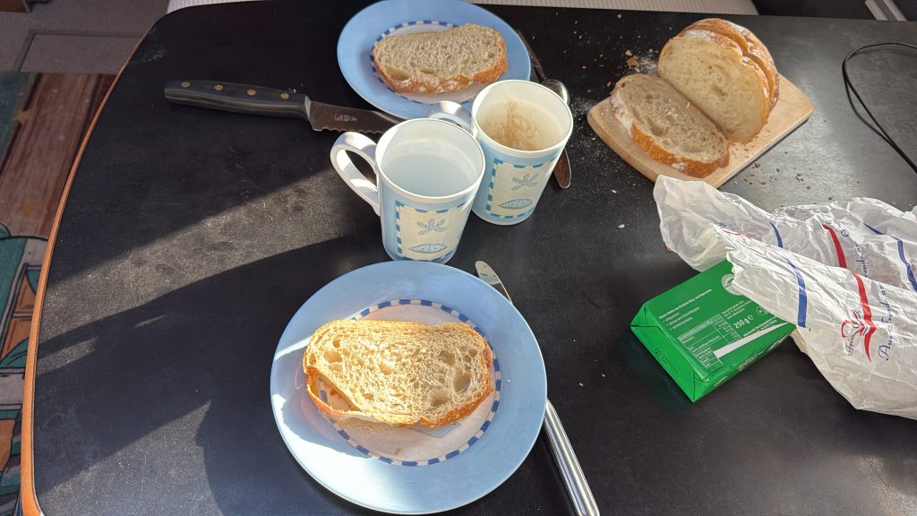 Petra hat fri­sche Sem­meln und Plun­der vom Bäcker im Ort geholt und nach einem ent­spann­ten Früh­stück mit Bial­et­ti-Kaf­fee sind wir genau­so ent­spannt wie­der auf die A7 und wei­ter in Rich­tung Nor­den. Die Plun­der haben wir uns für den Nach­mit­tags­kaf­fee unter­wegs auf­ge­ho­ben.