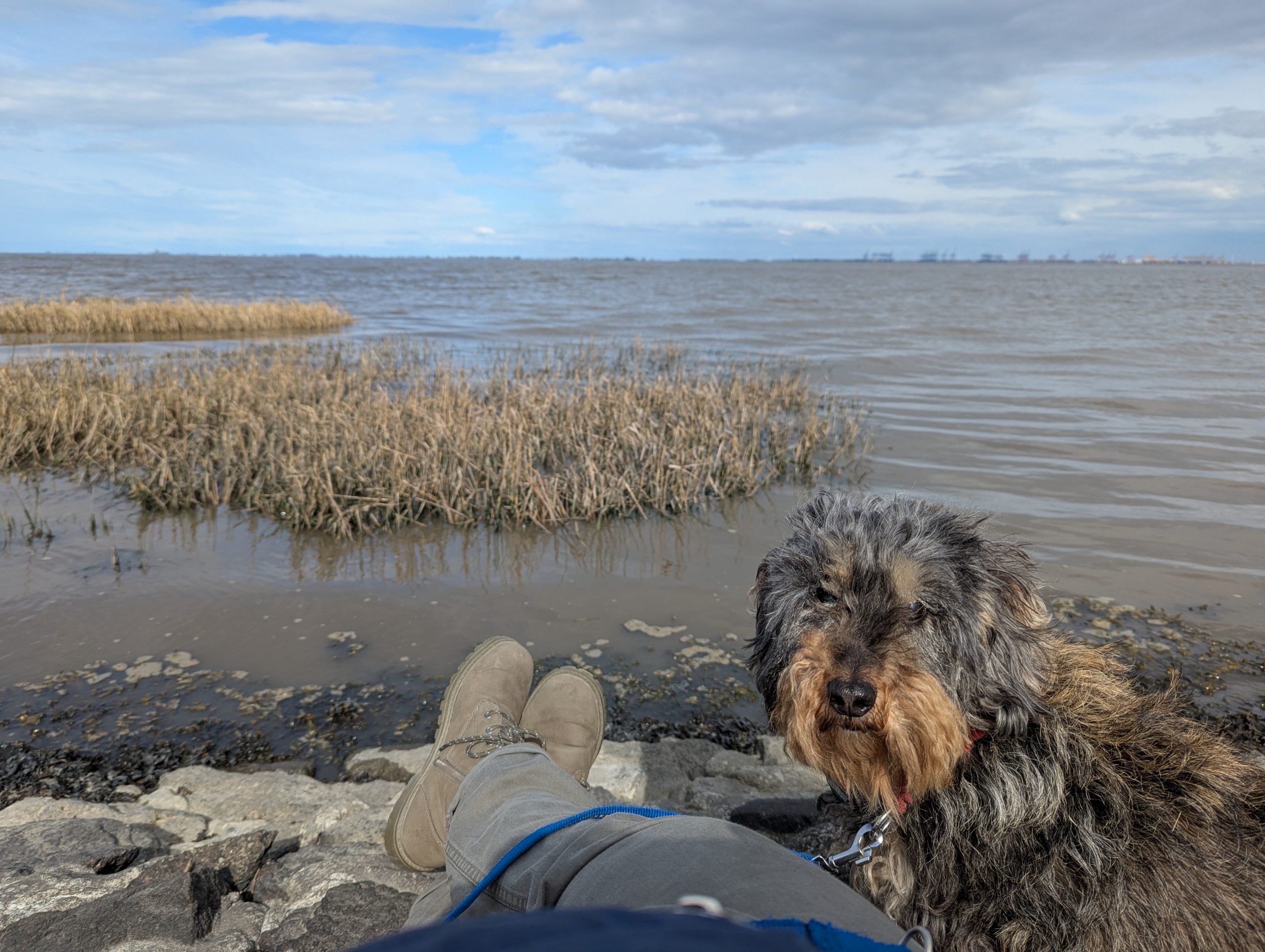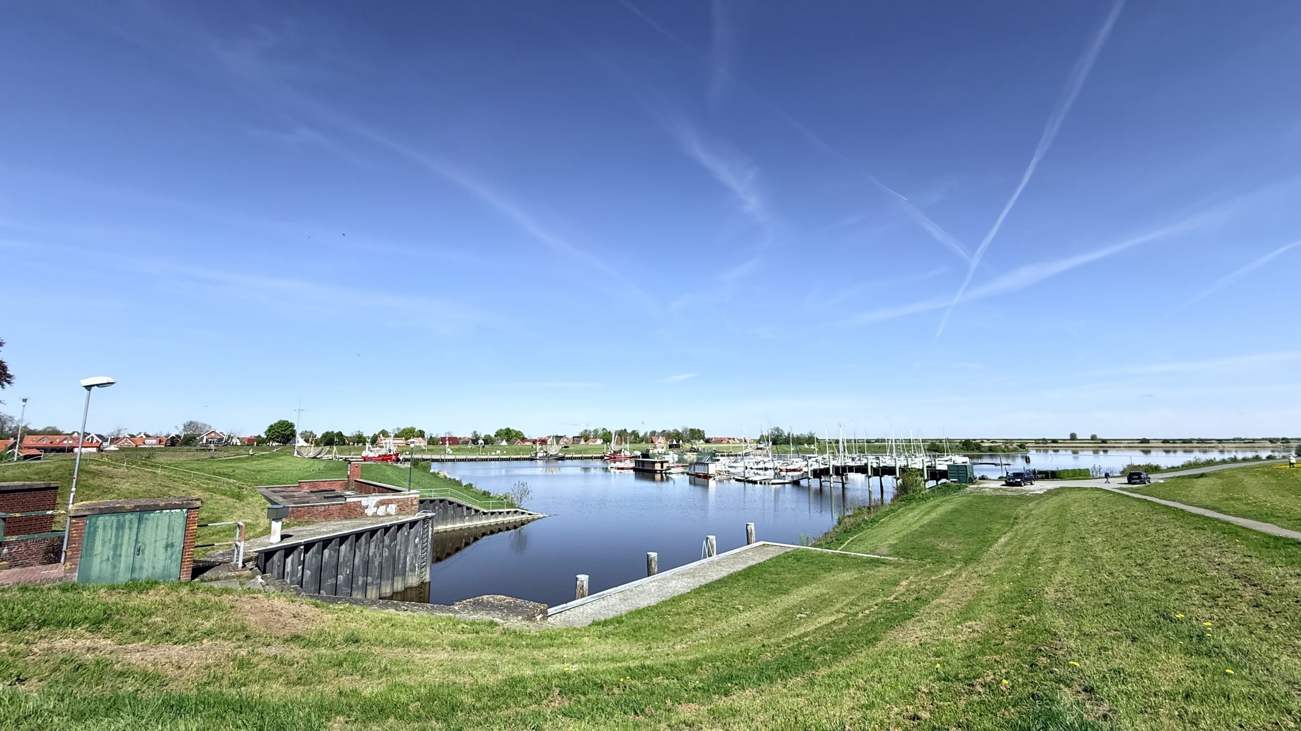 Anschlie­ßend sind wir bei bes­tem Wet­ter ein biss­le am Deich ent­lang gewan­dert und haben uns im Hafen umgesehen.
