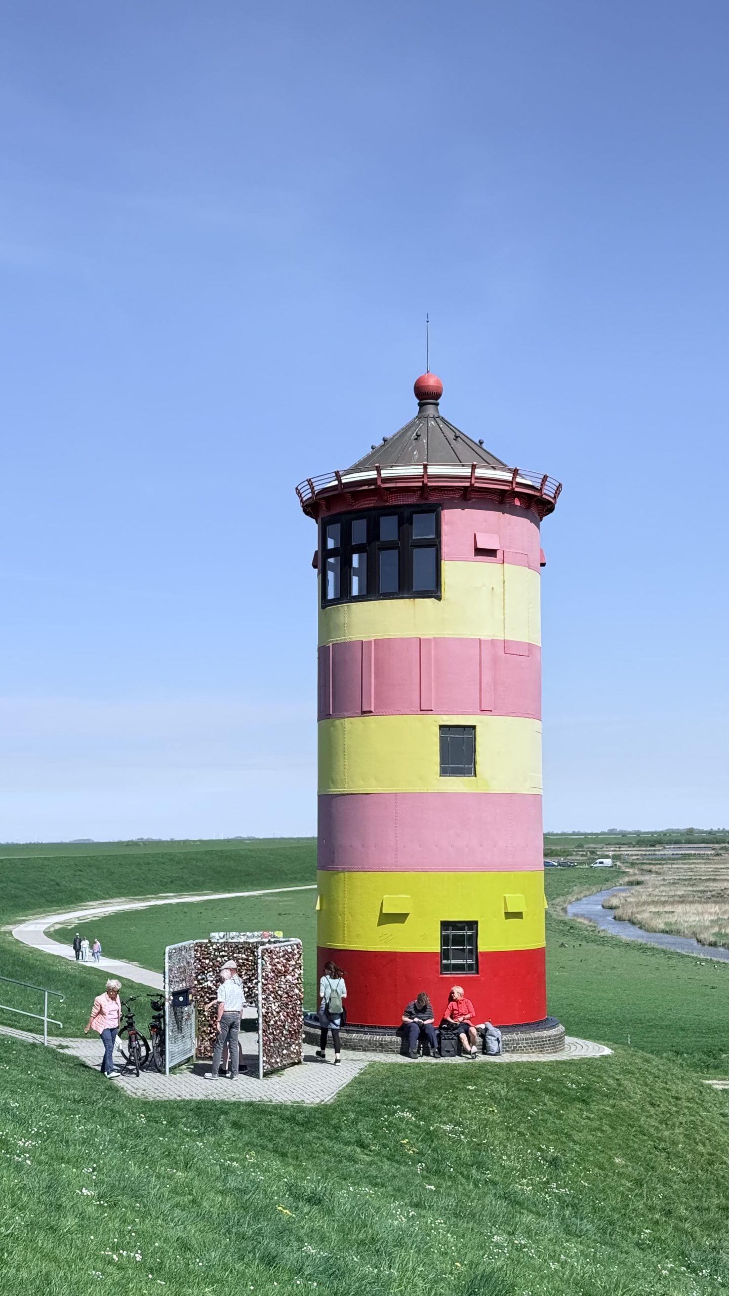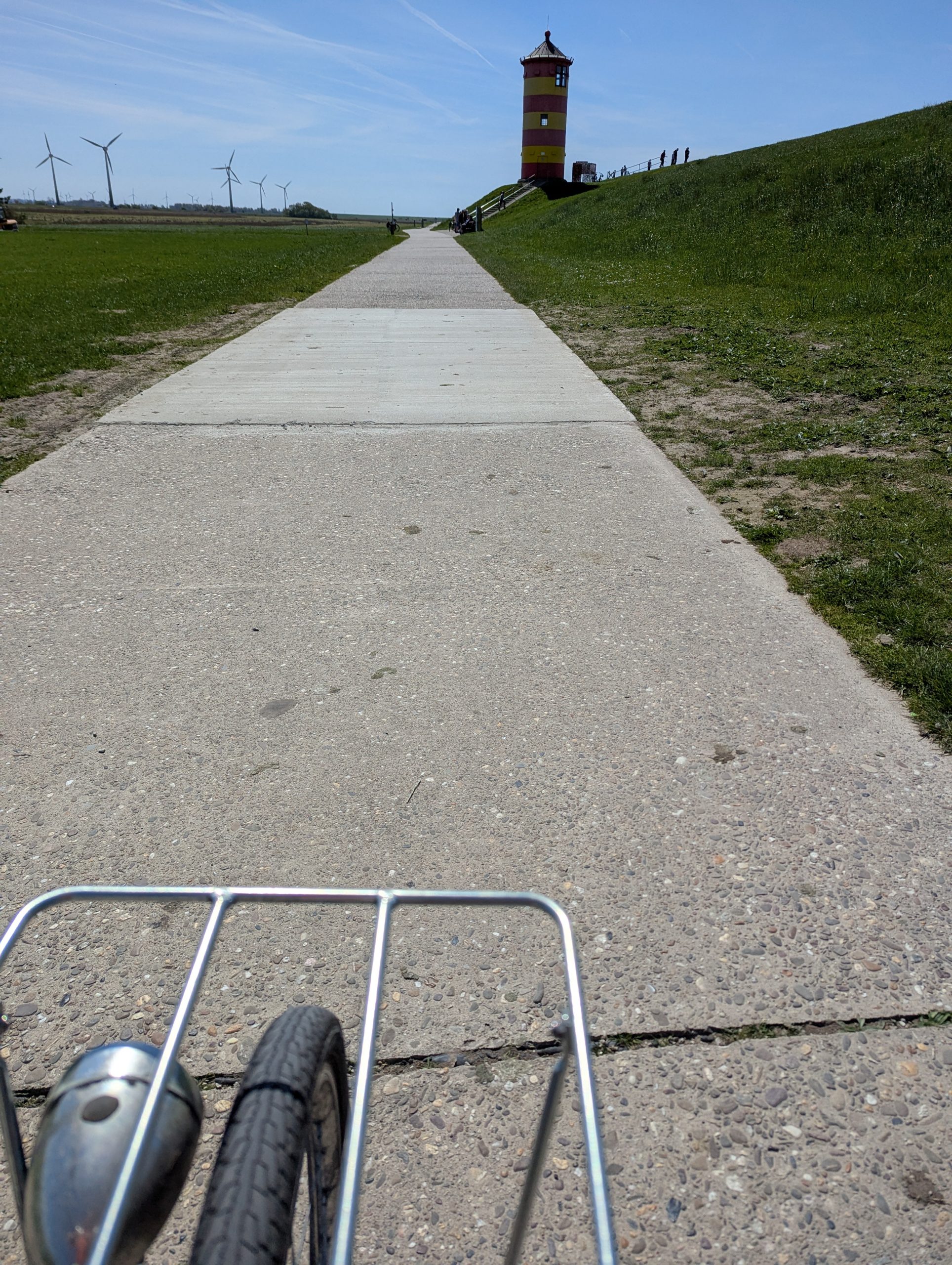 Heu­te haben wir unse­re Räder geschnappt und sind am Deich ent­lang nach Wes­ten zum Pil­su­mer Leucht­turm gera­delt – bekannt aus dem Film „Otto, der Außerfriesische“.