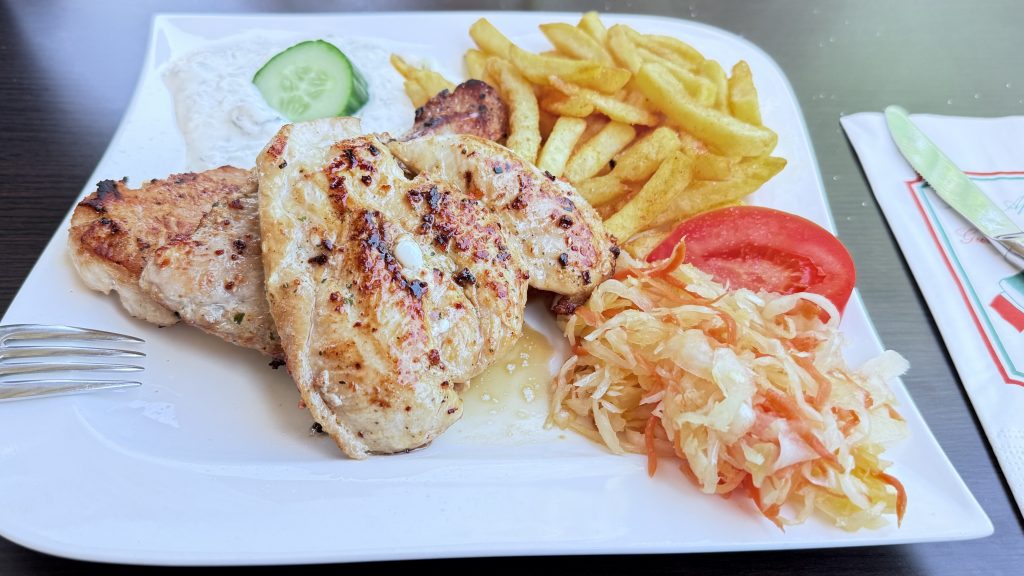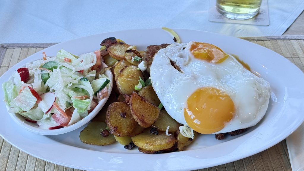Und so haben wir bei­de jeweils eine Por­ti­on Bau­ern­schnit­zel (das ver­steckt sich unterm dem Spie­gelei) geges­sen. Papp­satt – ab heu­te nur noch Seniorenteller! 🤪
