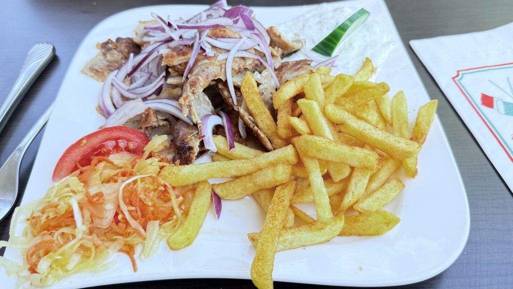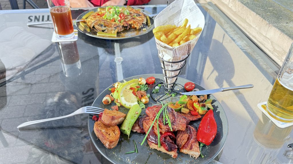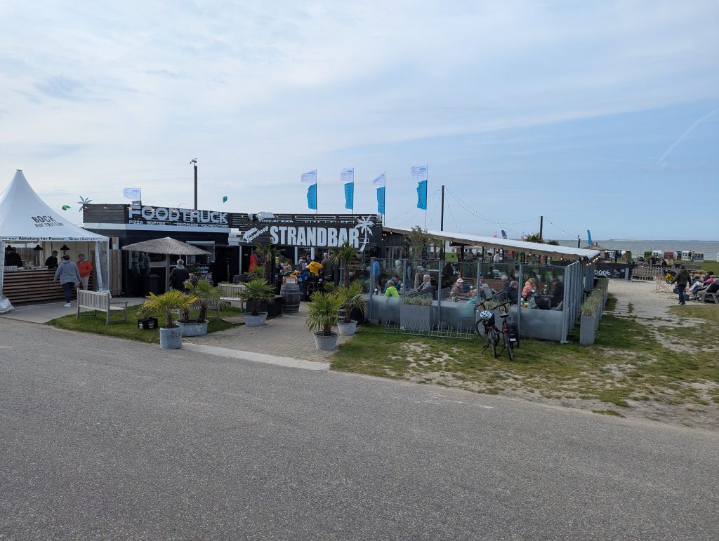 Zum Abschied haben wir im Café Mee­res­bri­se, das eher ein Imbiss ist, zu Abend geges­sen. Ich hat­te end­lich mei­ne Fri­kan­del Spe­cia­al und Petra einen gemisch­ten Salat mit Hüh­ner­brust­strei­fen. Sehr gro­ße Por­tio­nen zu einem sehr ange­neh­men Preis. 😎