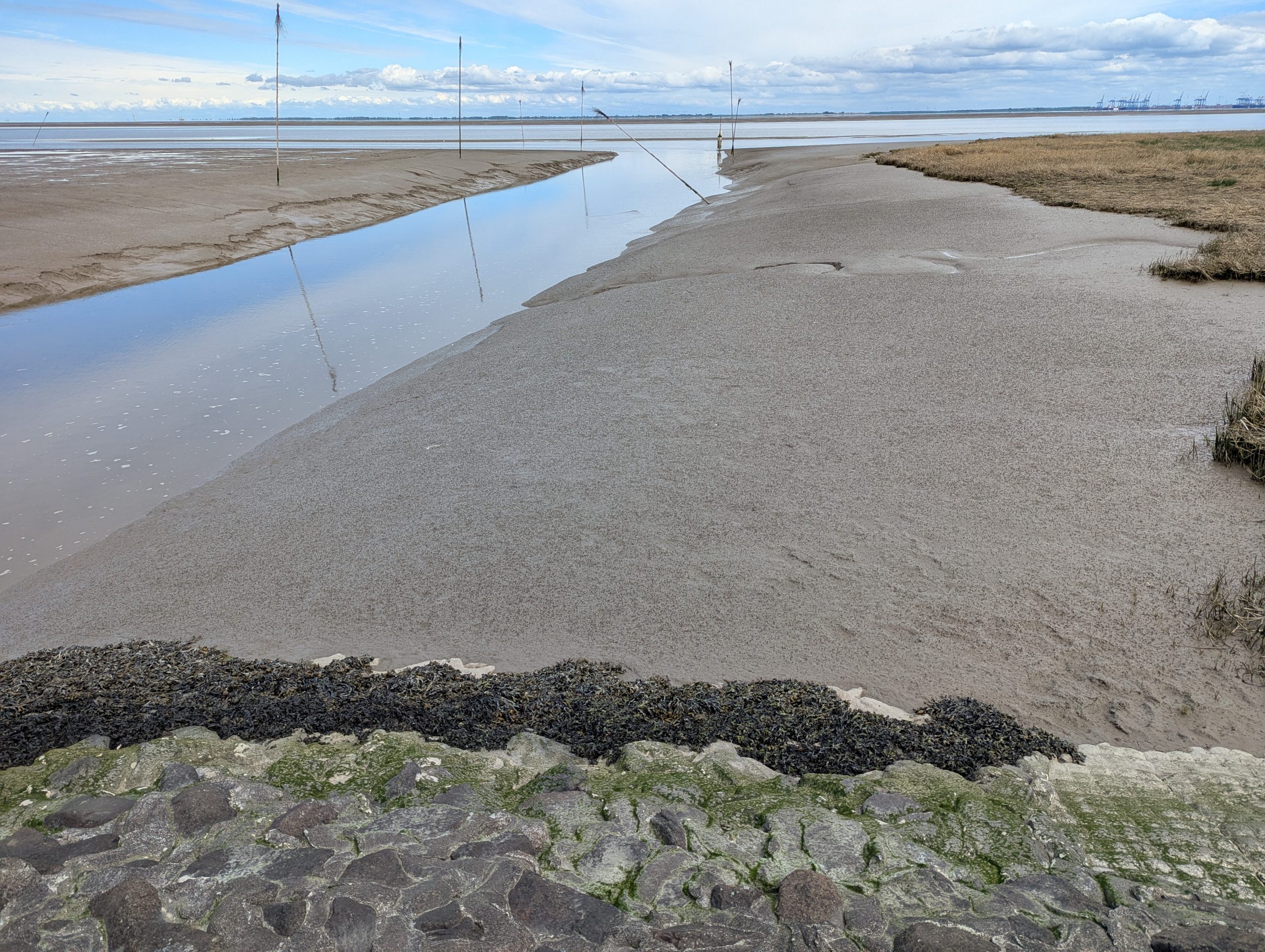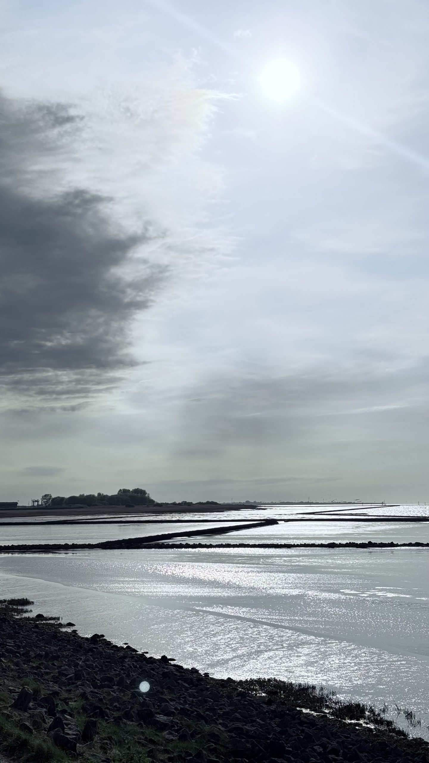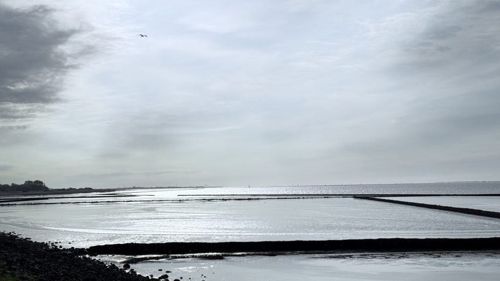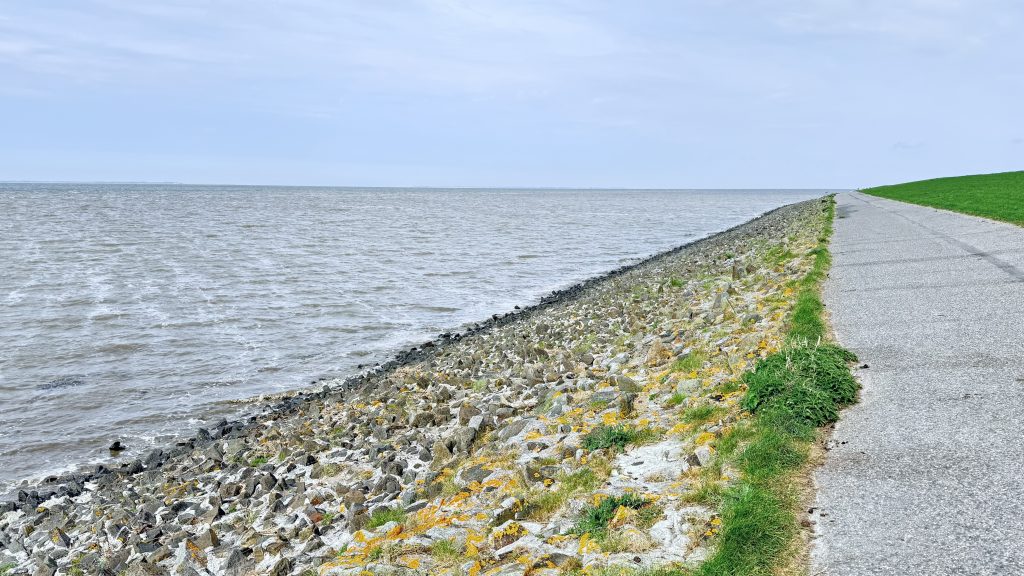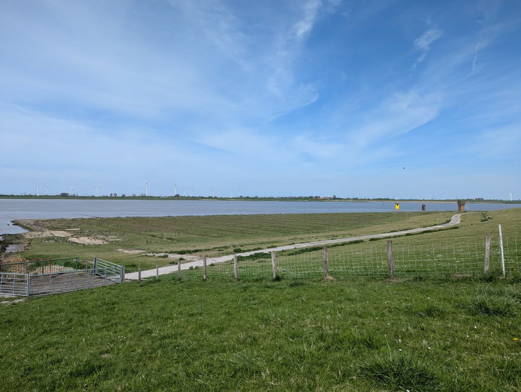 Mit dem Radl sind wir ein biss­le am Deich ent­lang, bis fast nach Lang­war­den und retour bis Bur­have. Petra hat’s dann geschmis­sen, weil sich ihr Vor­der­rad in den Rit­zen der Beton­plat­ten auf der Deich­kro­ne ver­fan­gen hat­te. Dar­auf­hin haben wir die Räder zurück zum Stell­platz gebracht und sind zu Fuß weiterspaziert.