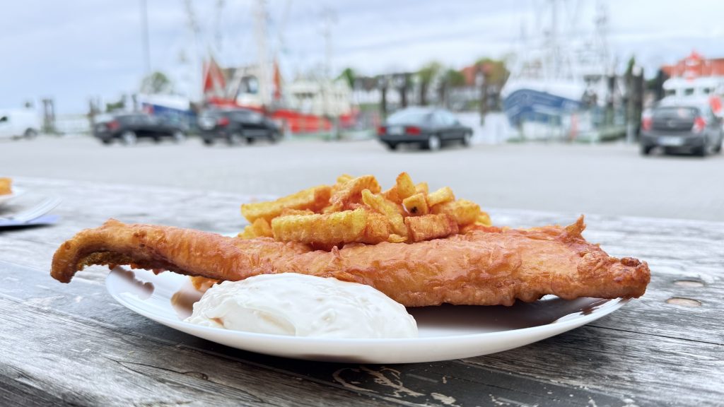 Abends haben wir den Hafen besucht und bei Michas Räu­cher­fisch direkt am Hafen bei den Kut­tern den leckers­ten Back­fisch süd­lich von Reykja­vik gegessen.