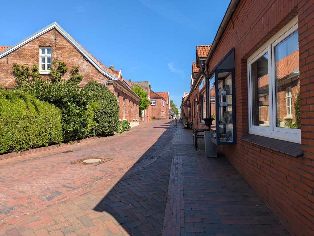 In Greet­siel waren wir vor etwa etwa 35 Jah­ren schon ein­mal für einem Tages­aus­flug, ich habe aller­dings kei­ner­lei Erin­ne­run­gen mehr dar­an – außer dass ich mir dort eine „ost­frie­si­sche“ Tee­kan­ne aus Mes­sing (außen ver­chromt) mit pas­sen­dem Stöv­chen mit­ge­nom­men habe. Könn­te ich eigent­lich auch mal wie­der benutzen…