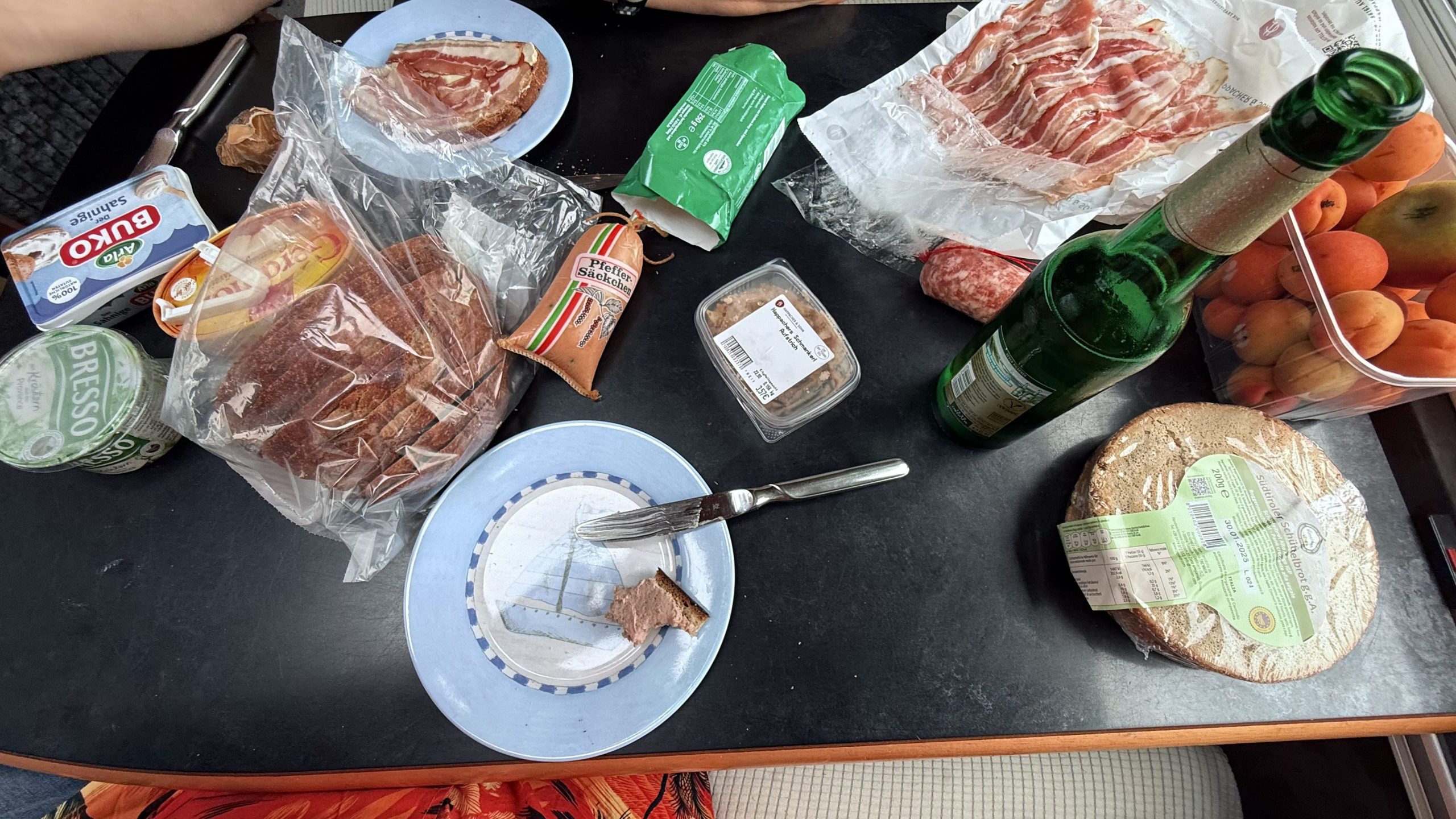 10:30 Uhr, nach einem gemütlichen Frühstück mit Semmeln vom Platzrestaurant hat’s etwas aufgehellt und das Solarpanel liefert endlich ein bissle Strom. Gleich mal die Kühlbox angesteckt, dass das Bier wieder kalt wird. 🍺 Neben mir dudelt das für Notfälle angeschaffte Kurbelradio Bayern 1 – alles prima! 😊