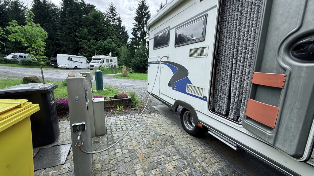 1 € für 100 L Wasser. Das praktische am Wohnmobil ist, dass man – wie der Name schon sagt – „mobil“ ist. Also kein angeflanschtes Vorzelt, abgehängter Zugwagen, etc. Verstauen muss man innendrin trotzdem alles, besser ist das… 😂