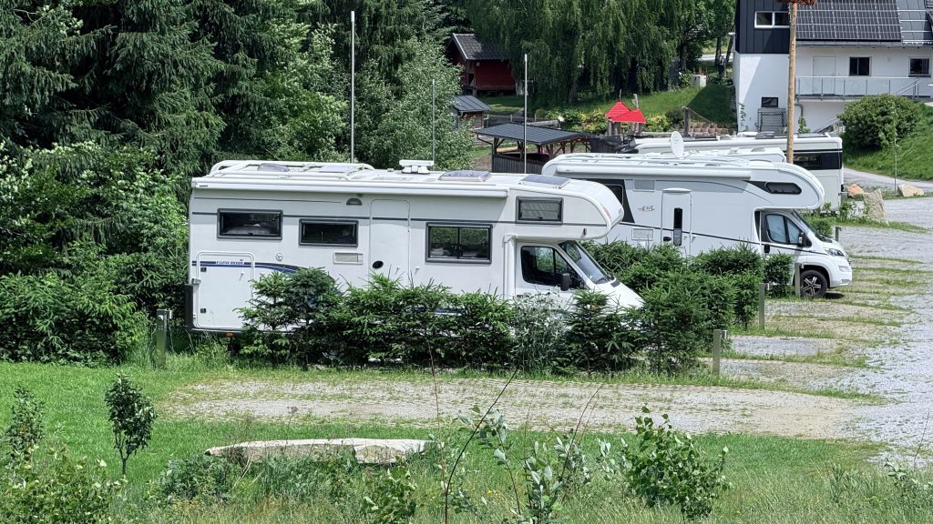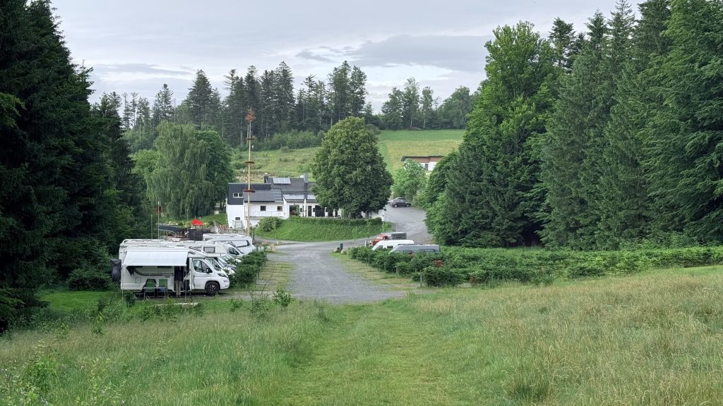 Um viertel vor drei Uhr waren wir dann hier am terrassierten Platz am Hang, stehen brettleben direkt unter dem WLAN-Accesspoint, haben Strom (1€ /kWh), den man unten am Anfang der Stellplätze an so einem Möchtegerncomputer buchen muss – leider hat das Touch-Display so gut wie keinen Touch mehr, so dass es eine Herausforderung ist mit der Bedienung. Naja, die 2 €, die ich gestern Abend eingeschmissen habe, haben die Aufbaubatterien ca. 10 Stunden lang über Nacht mit Strom versorgt. 👍