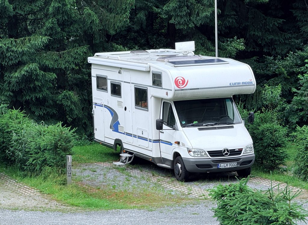 Die Aufbaubatterie war abends wieder bei 12,6 V angekommen, drum habe ich nochmal 2 € für nächtlichen Landstrom spendiert. Die automagische Umschaltung des Kühlschranks von 230 V auf 12 V oder Gas ist saupraktisch! Da kannst nachts beim Bisln gehen immer an den LED sehen, ob’s noch Landstrom hat. 😎