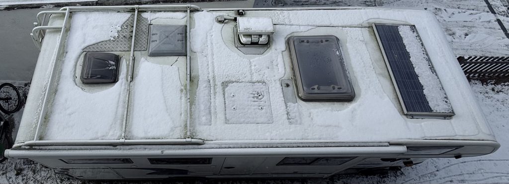 Was man aber gut erkennen kann: Da ist noch viel Platz obenrum. Zwischen der großen Luke und der kleinen am Heck soll ein grooßes Solarpanel mit 500 Wp hinkommen (das Panel ist knapp 2 m lang, mehr wird nicht hinpassen). Oder zwei, das zweite dann quer auf die Reling. Vielleicht wird auch noch das vorhandene – mit 100 Wp geschätzte – Panel auf dem Alkoven ersetzt, allerdings stellt sich hier die Frage, wie die Durchbohrungen des Daches wieder abzudichten wären. Ein Vorbesitzer hat nämlich Alu-Winkel mit ganz hässlichen durchgehenden Maschinenschrauben befestigt. 😩